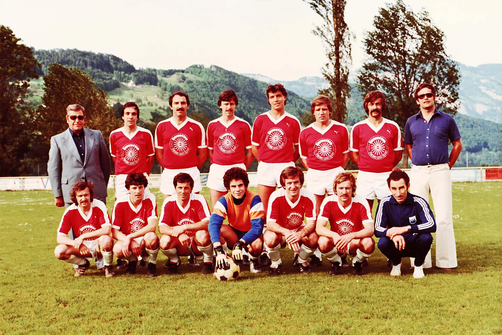 Mit­te v.l.n.r.: Chris­toph Baum­gart­ner (Spon­sor), Heinz Fischer (Co-Prä­si­dent), Alo­is Bar­mett­ler (Assis­tent), Faras Haya­vi (Trai­ner), Jan von Büren (Mas­seur), Armin Trutt­mann (Tor­hü­ter­trai­ner), Dani­el Gas­ser (Co-Prä­si­dent)