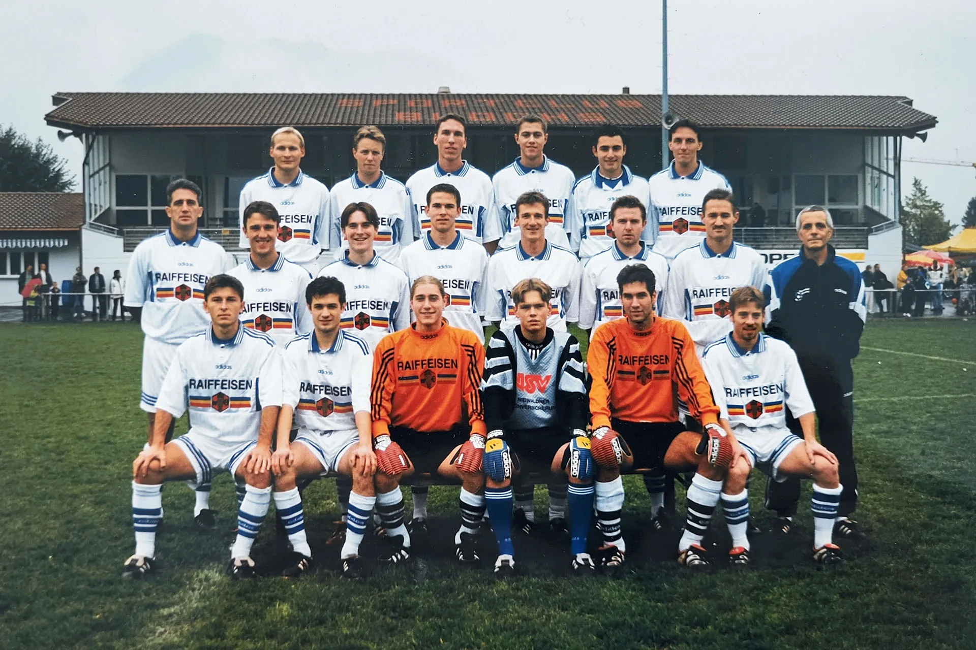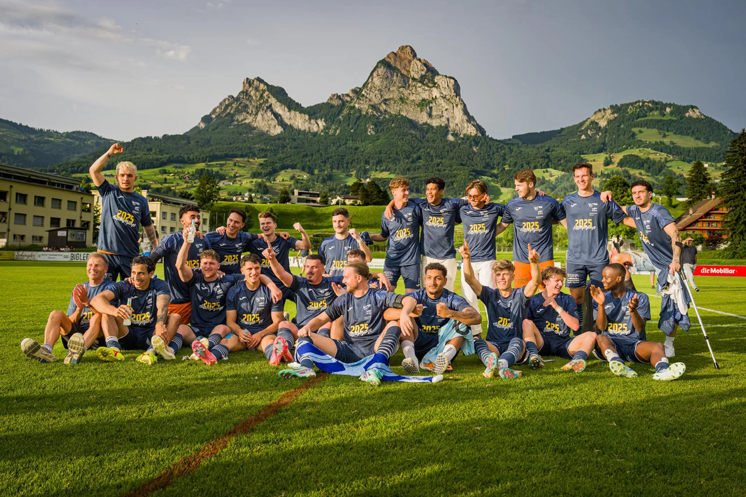 Mit­te v.l.n.r.: Heinz Fischer (Co-Prä­si­dent), Nil Nie­der­ber­ger, Avdi Beri­sha, Alo­is Bar­mett­ler (Fit­ness), Mar­co Spiess (Trai­ner), Dani­el Zim­mer­mann (Tor­hü­ter­trai­ner), Zen­un Seli­mi (Assis­tent), Pas­cal Wüth­rich (Mas­seur), Timo Ber­tuc­ci, Ema­nue­le Gui­dot­ti, Chris­toph Baum­gart­ner (Spon­sor), Dani­el Gas­ser (Co-Prä­si­dent)