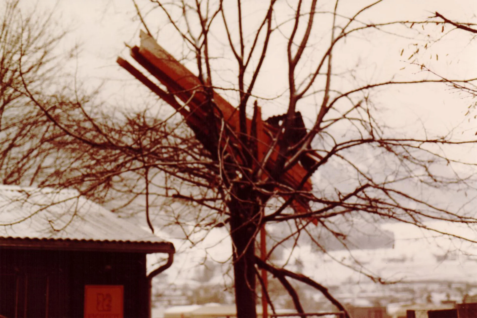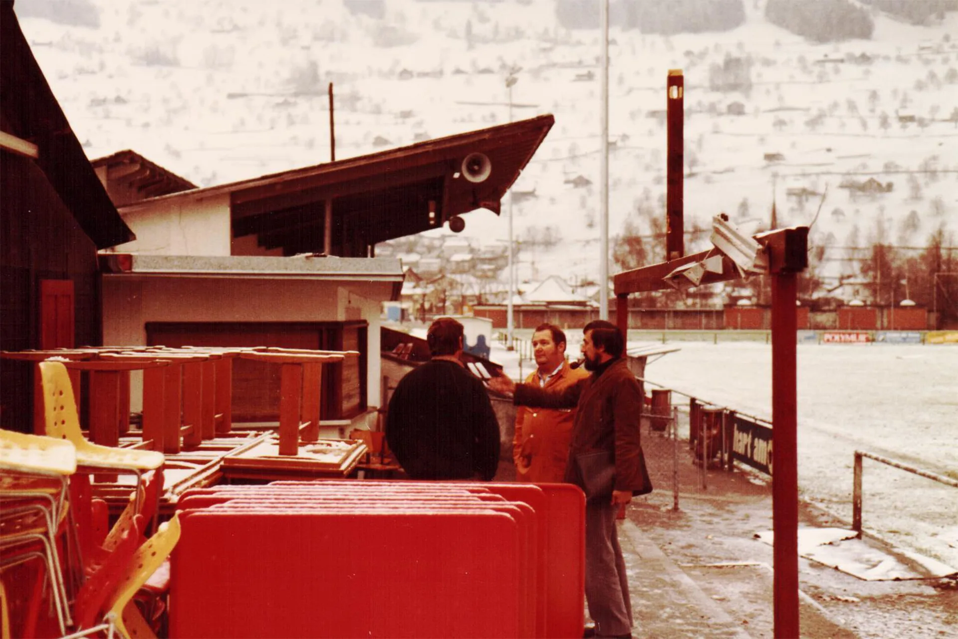Geschenk an den SCB: Die Baubaracke, die inzwischen der Holzbau Häcki AG, der Rinderknecht AG und der Dinkel und Korner AG gehörte, wurde 1986 von diesen Firmen dem Sportclub Buochs geschenkt.