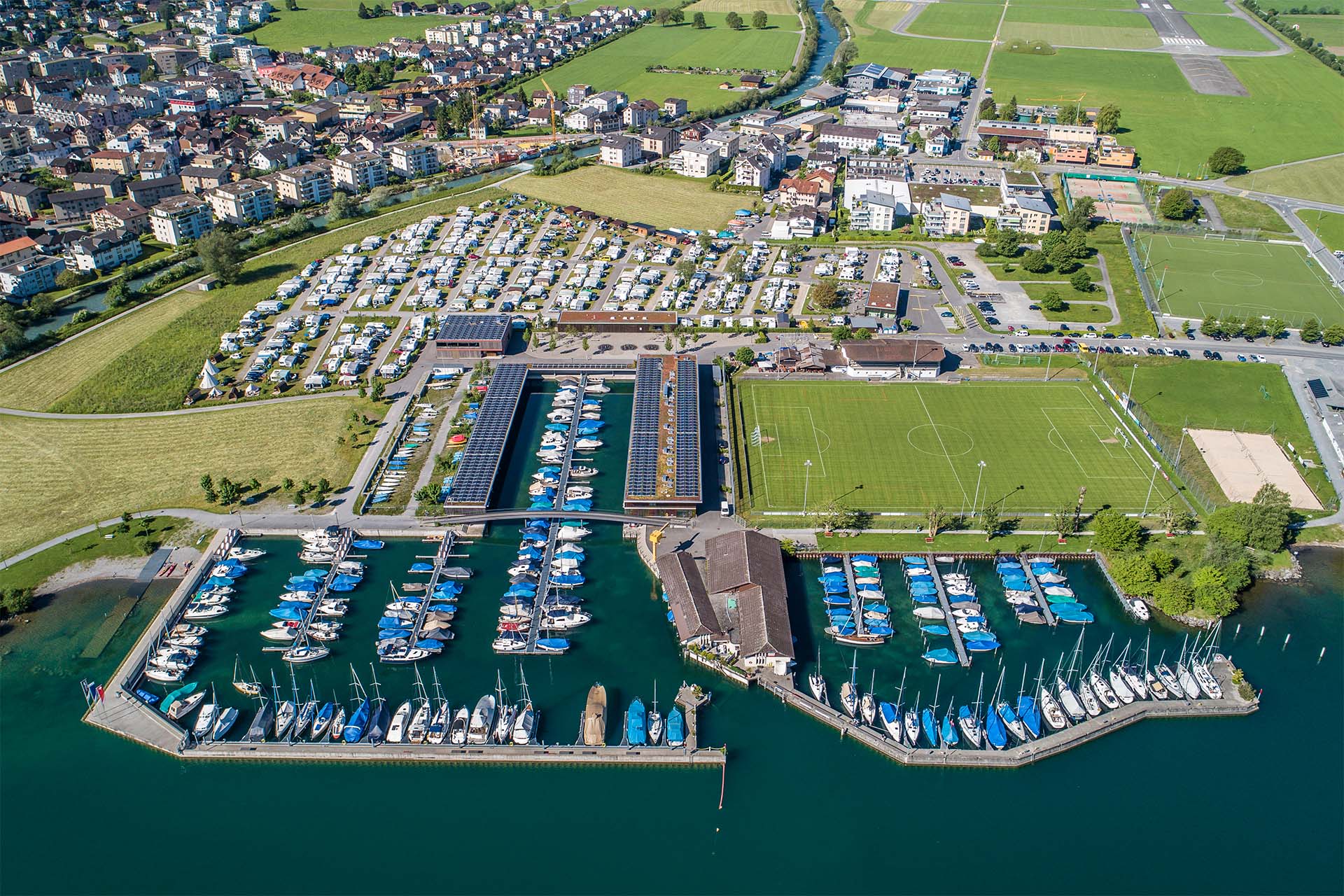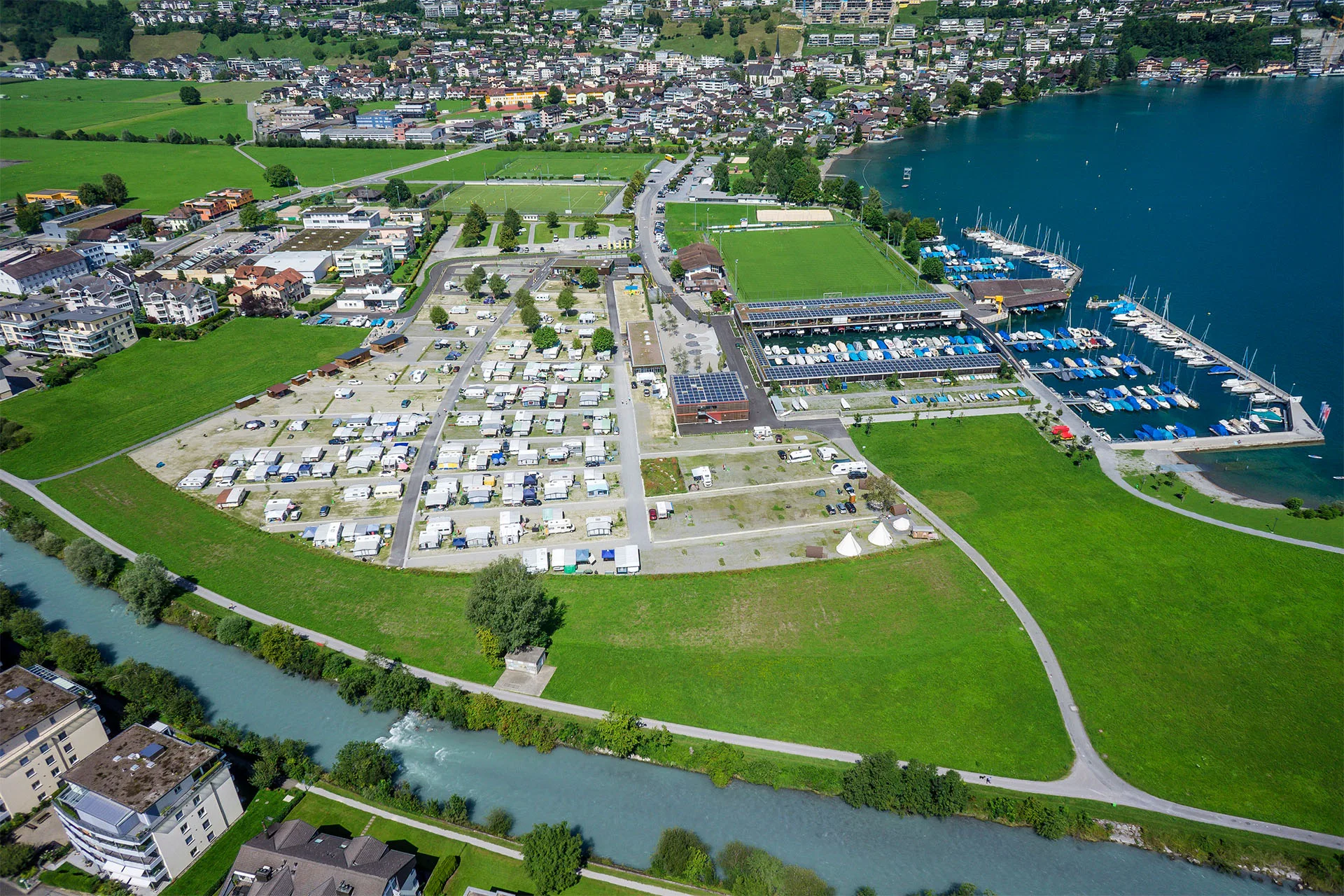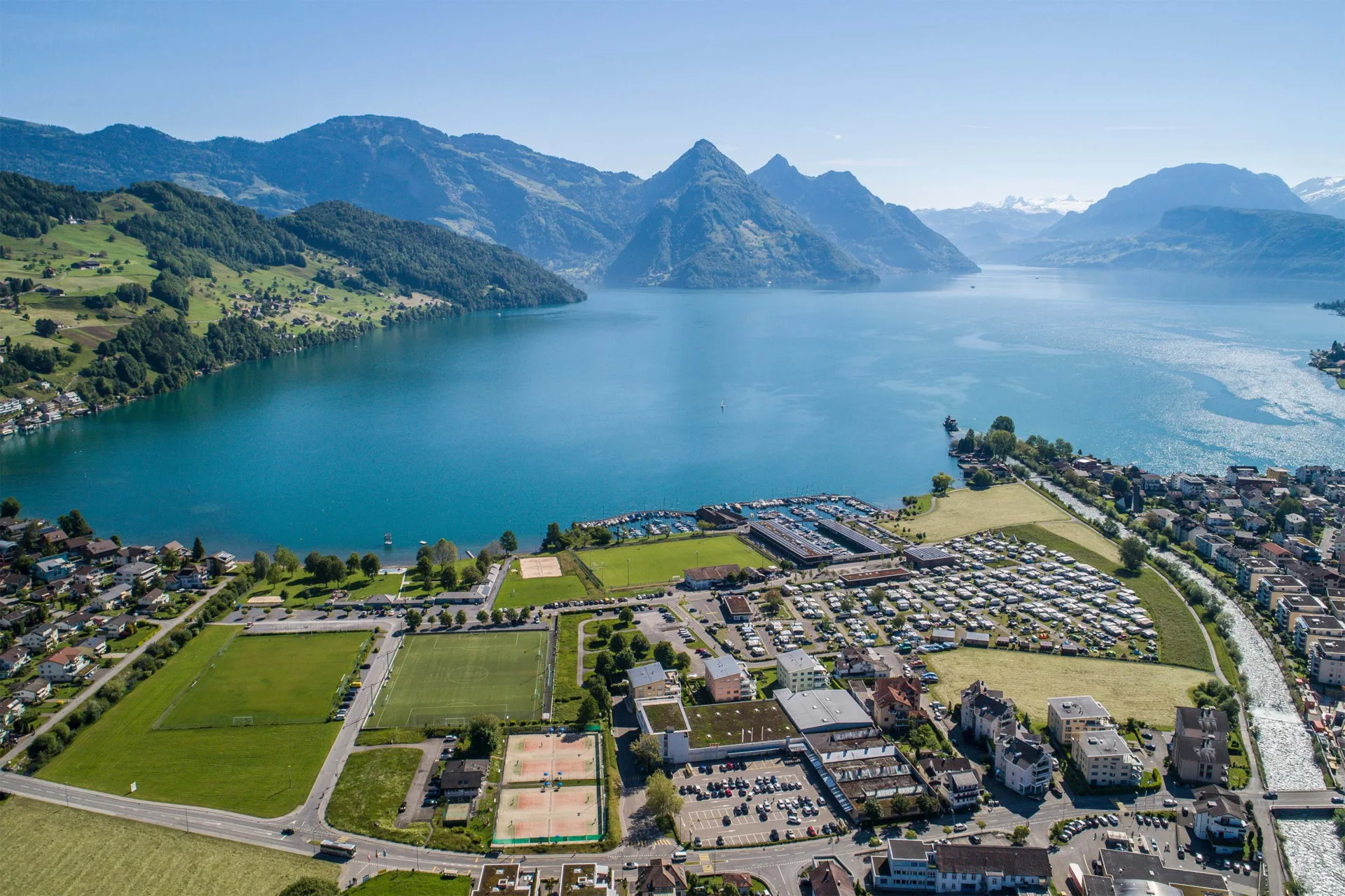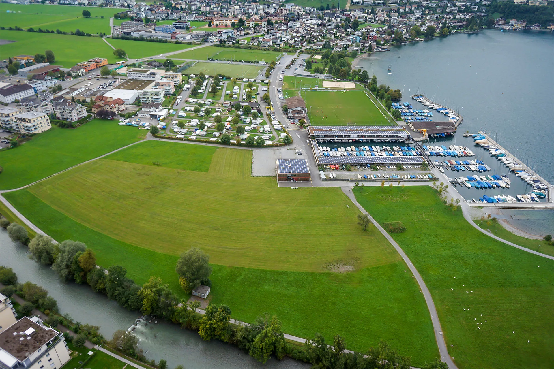 Schön eingebettet zwischen See und Bergen, respektive „Badi“, Camping, Tennisplatz und Bootshafen. So mancher Gast reibt sich vor Verwunderung die Augen über die grossartige Aussicht, welche einem geboten wird, wenn man ein Spiel von der Tribüne aus mitverfolgt. Nicht ohne Stolz rühmen sich die «Sportclübler» an einem der schönsten, wenn nicht am schönsten Ort der Schweiz, Fussball spielen zu dürfen.