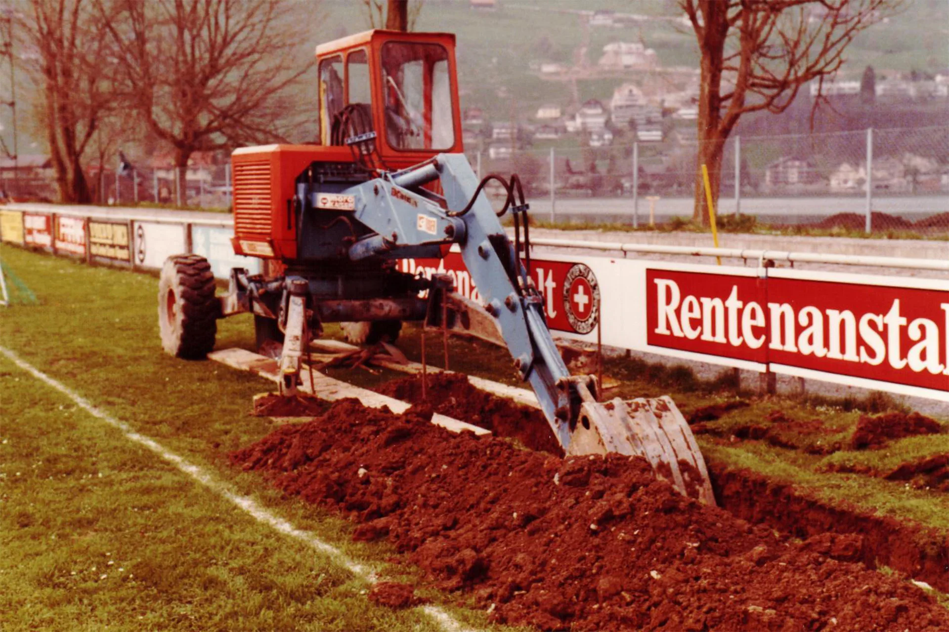 Als mit dem Bau der Stollen am Bürgenberg begonnen wurde, nutzte man die Gelegenheit, um an günstiges Ausbruchsmaterial zu kommen. Mit diesem Ausbruchsmaterial wurde der Platz in Fronarbeit rund 80 cm angehoben. Während der Bauzeit 1953 – 1956 spielte Buochs auf einer kleinen Wiese südlich des heutigen Bootshafens. Auf dem prächtigen, neuen Spielfeld konnte 1956 der Spielbetrieb wieder aufgenommen werden. Mit Stolz konnte der Verein auf die sehr grossen Eigenleistungen in den vergangenen 3 Jahren zurückblicken.