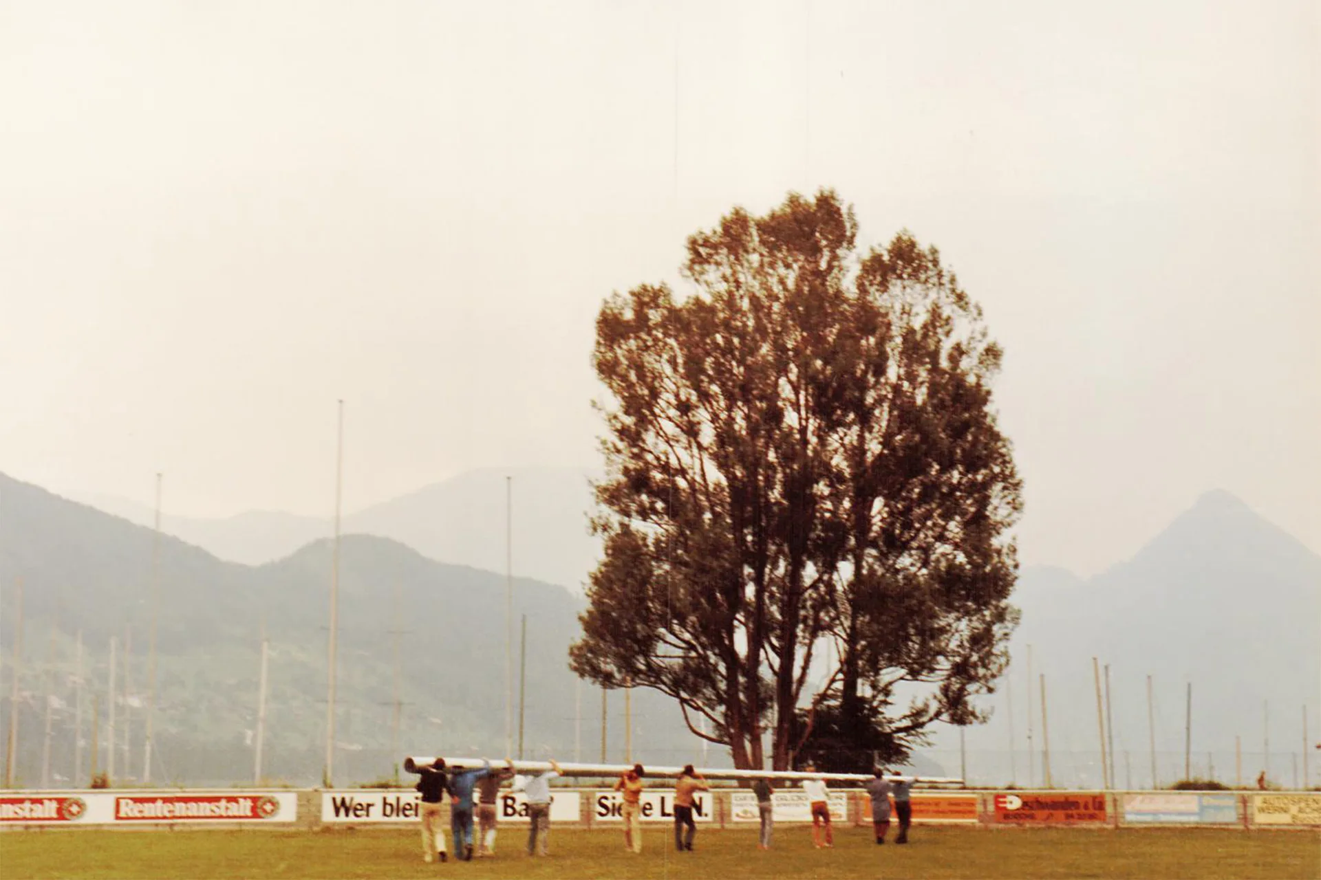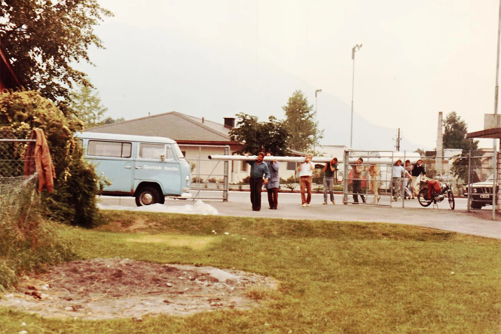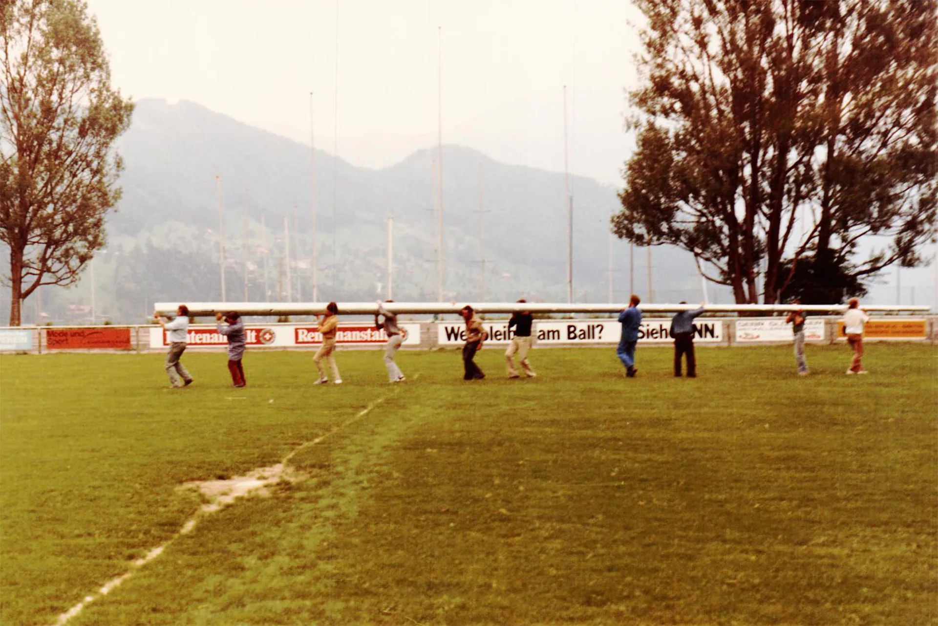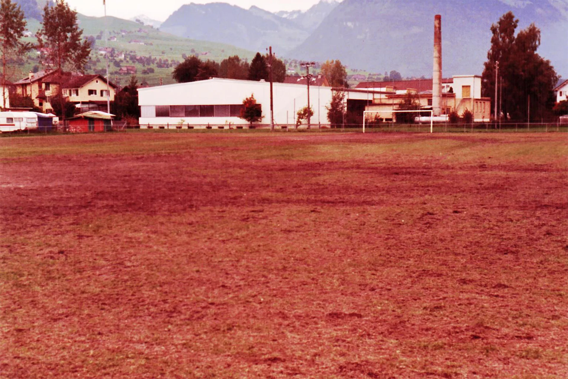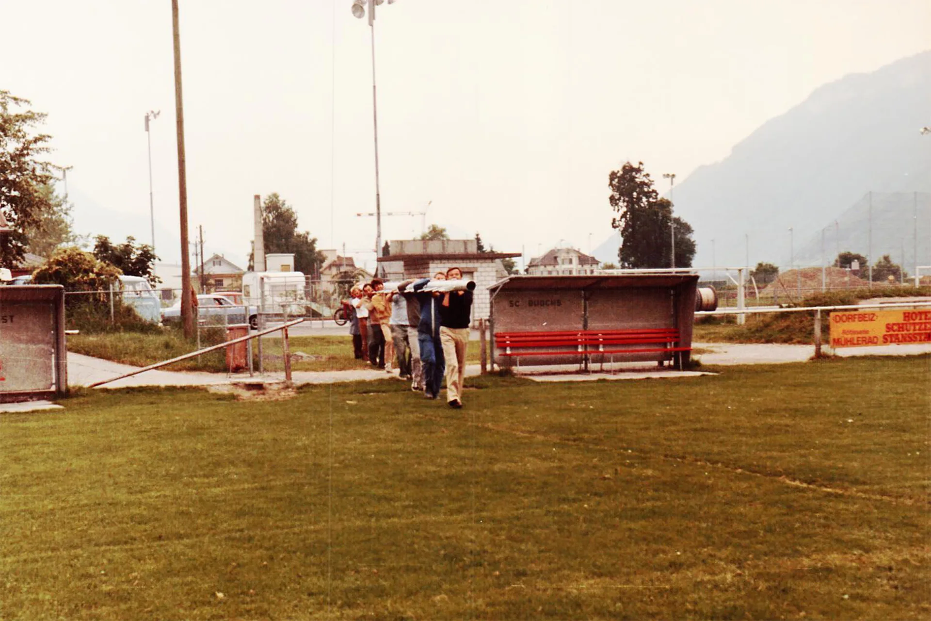 Im Laufe der folgenden Jahre nahm die Anzahl Fussballer*innen und Mannschaften stetig zu. Deshalb wurde Mitte der 1970er Jahre das Garderobengebäude mit einem Holzbau-Pavillon ergänzt. Dieser bot zusätzlich Platz für 3 Garderoben und eine Schiedsrichterkabine.
