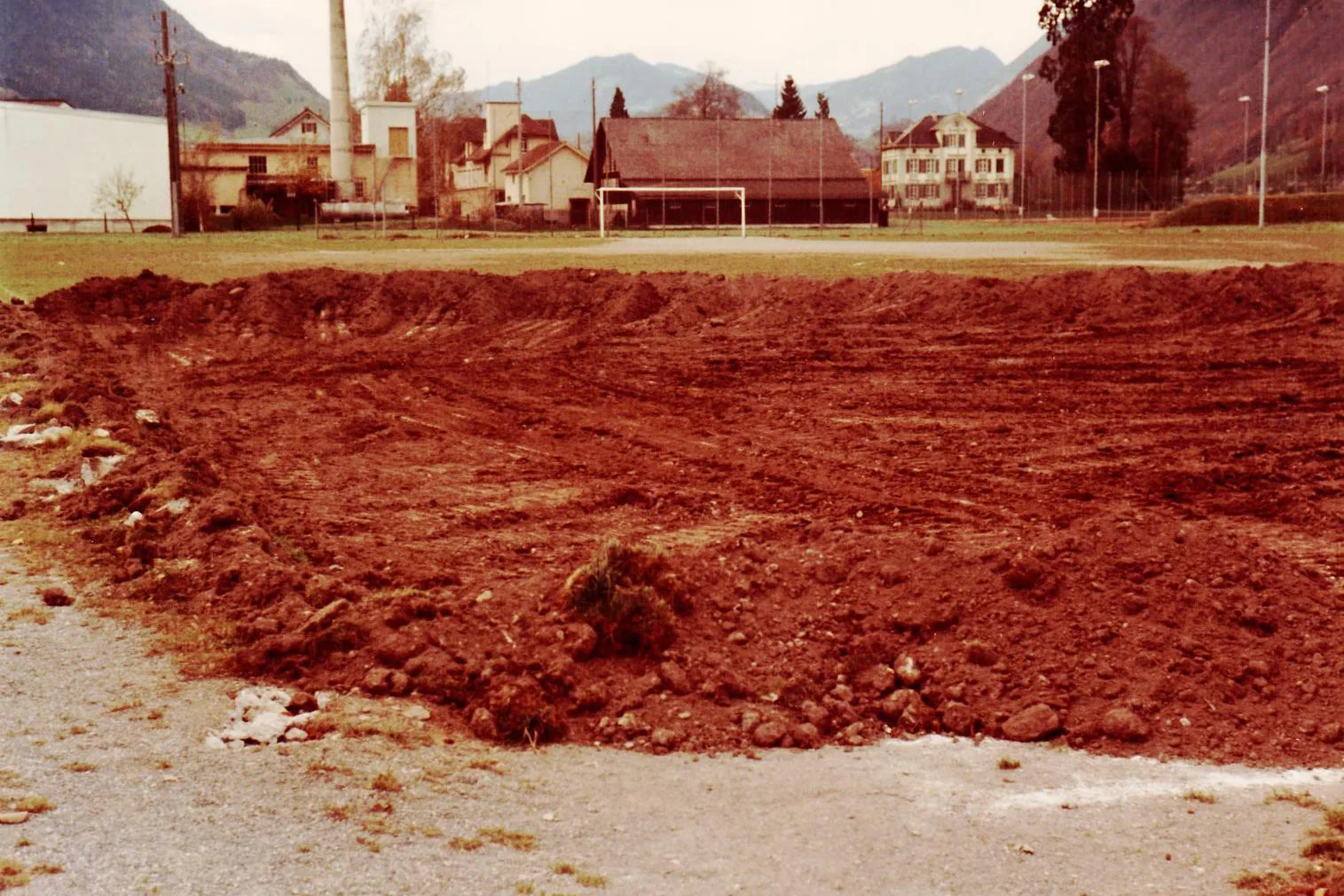 Der Platz befand sich damals inmitten eines sumpfigen Gebietes, wo man ringsum die Frösche quaken hörte. Der Boden war lehmig und wurde durch den Fussballbetrieb immer mehr wasserundurchlässig. Nicht selten kam es bei hohem Seespiegel vor, dass beinahe das ganze Spielfeld unter Wasser stand. Mindestens eine halbe Woche vor einem Spiel durfte es in den kälteren Jahreszeiten nicht regnen, sonst kam es am Sonntag jeweils zu ergötzlichen Wasser- und Schlamm-Schlachten. Die Platzsituation wurde nach dem Krieg immer prekärer als noch eine Juniorenmannschaft sowie eine weitere Aktivmannschaft hinzukamen. Als einmal sogar das traditionelle Fussballturnier wegen Hochwasser auf der Wiese eines Bauern ausgetragen werden musste, wollte der damalige Präsident Hansruedi Schneider, nicht mehr länger zusehen. Kurzerhand stellte er 1952 eine Baukommission von namhaften Persönlichkeiten auf die Beine, welche den Auftrag hatte, für bessere Platzverhältnisse zu sorgen. Diese bestand aus: Josef Wyrsch (Polizeidirektor), Josef Huser (Schatzungsbeamter), Werner Odermatt (Schürmatt), Bruno Amstad (Landschreiber), Fritz Weber (DMP-Angestellter), Remigi Blättler (Hotel Rigiblick) und Josef Frank (Schreinermeister).