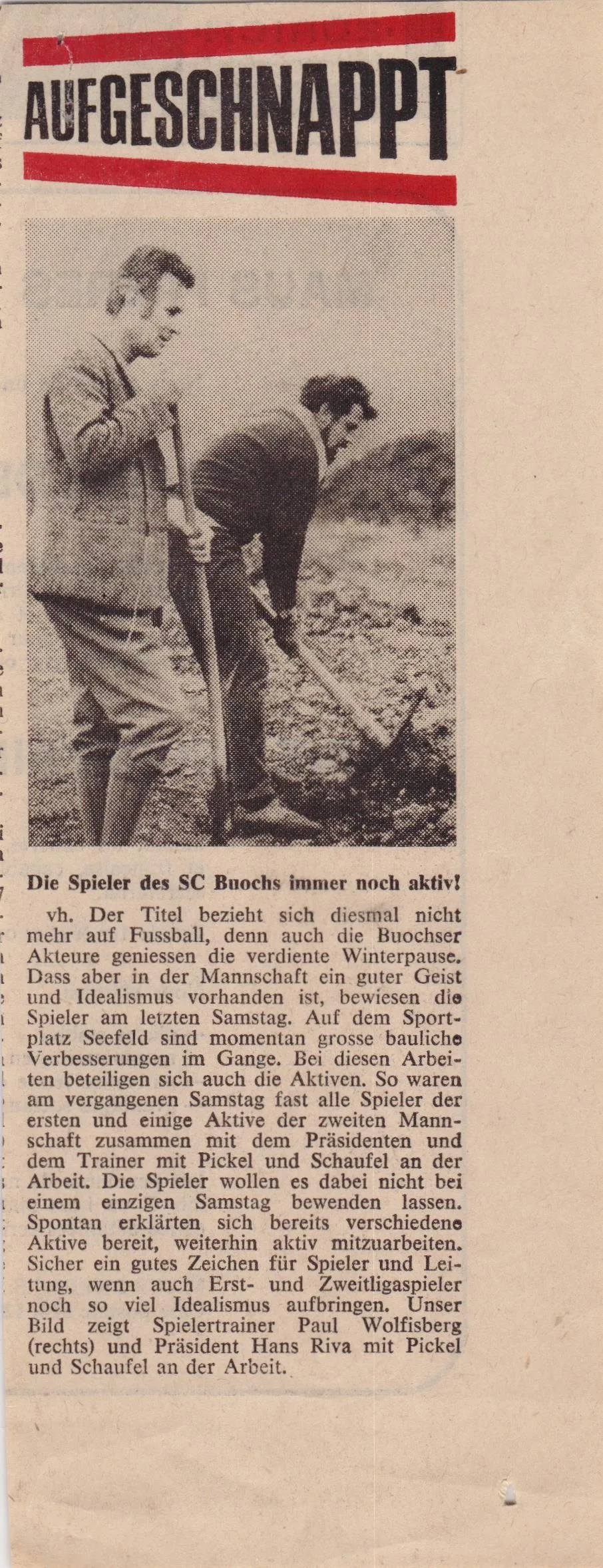 Zwischen 1969 und 1972 spielte der SCB viermal in Serie um den Aufstieg in die Nationalliga B, der damals zweithöchsten Landesliga. Im erfolgreichen vierten Anlauf war Peter Risi, der später dreimal Torschützenkönig der Nationalliga A (1‑mal mit dem FC Zürich, 2‑mal mit dem FCL) wurde, nicht mehr Stürmer seines Heimatklubs. Vor 5500 Zuschauern – bis heute Stadionrekord im Seefeld – sicherte sich der SC Buochs dank Toren von Ernst Bühlmann (2) und Othmar Sager mit einem 3:2‑Sieg über Nyon den NLB-Platz. Der Höhepunkt der Klubgeschichte war 1972 also erreicht, dazu spielte die zweite Mannschaft in der 2. Liga und die dritte Mannschaft in der 3. Liga.